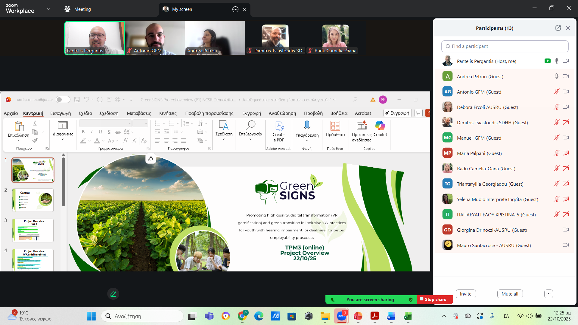 The 3rd Transnational Project Meeting (TPM3) of the GreenSIGNS project was held online on 22 October, bringing together all consortium partners to review progress, discuss deliverables across Work Packages (WP2–WP5),